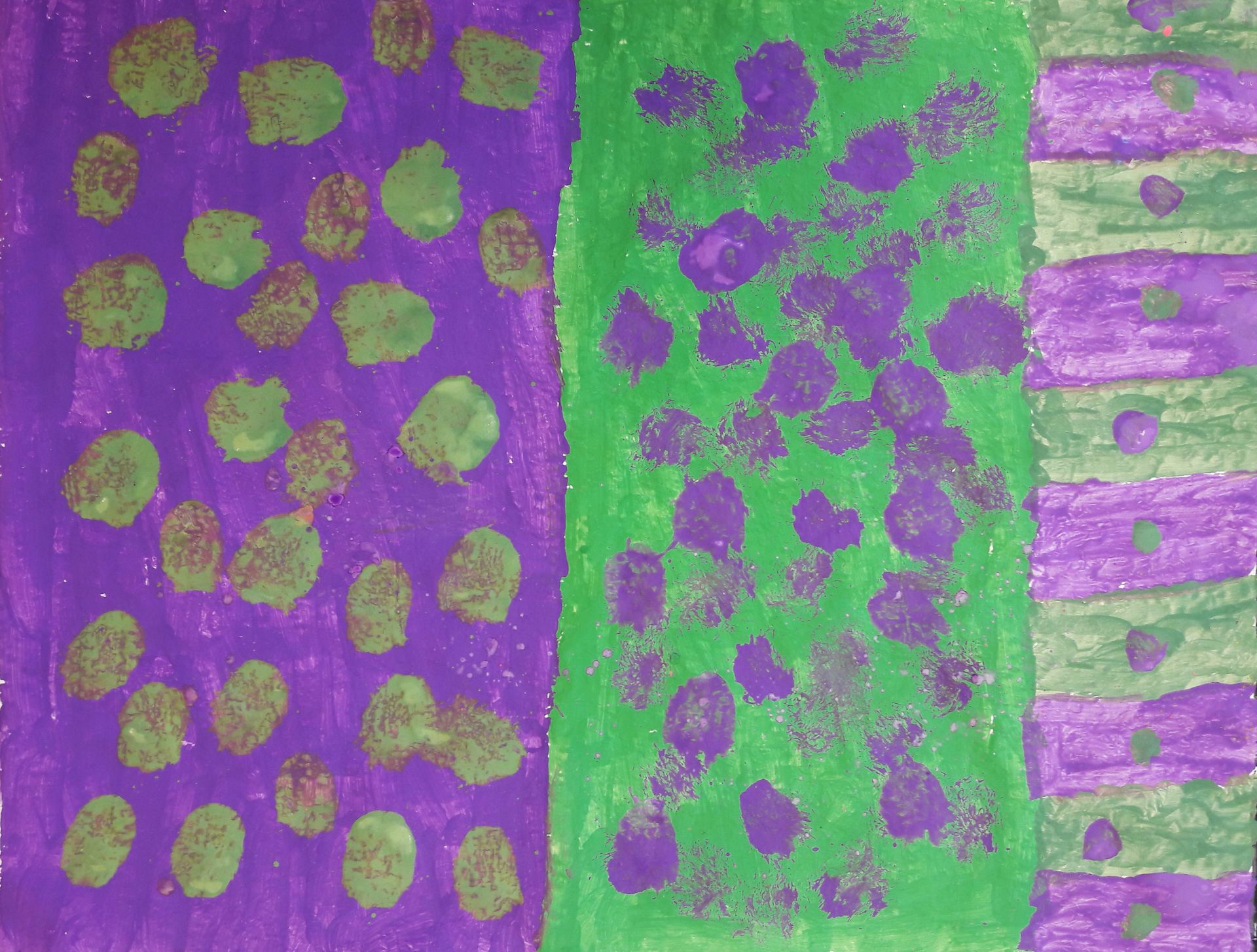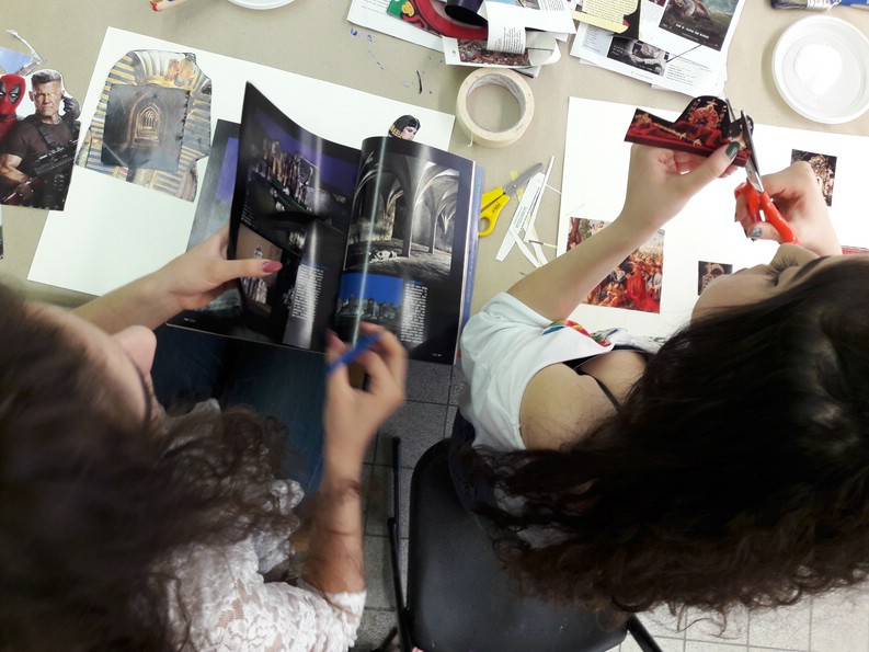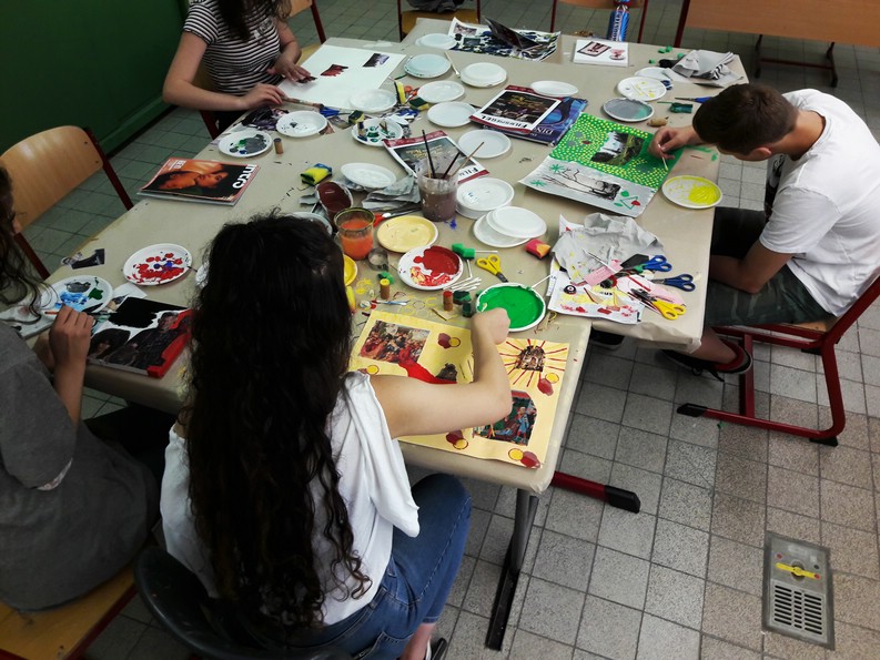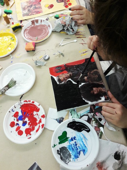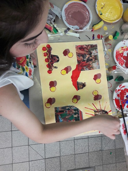 Zwei Kunst- Kulturtage in der Hauptschule Oberhausen, im Rahmen des Kulturagentenprogramms. Auswählen, kleben, mit Acrylfarbe malen und drucken, mit unterschiedlichsten Materialien wie Schwamm, Kronkorken, Holzstücken, Q-Tips und vielem mehr.