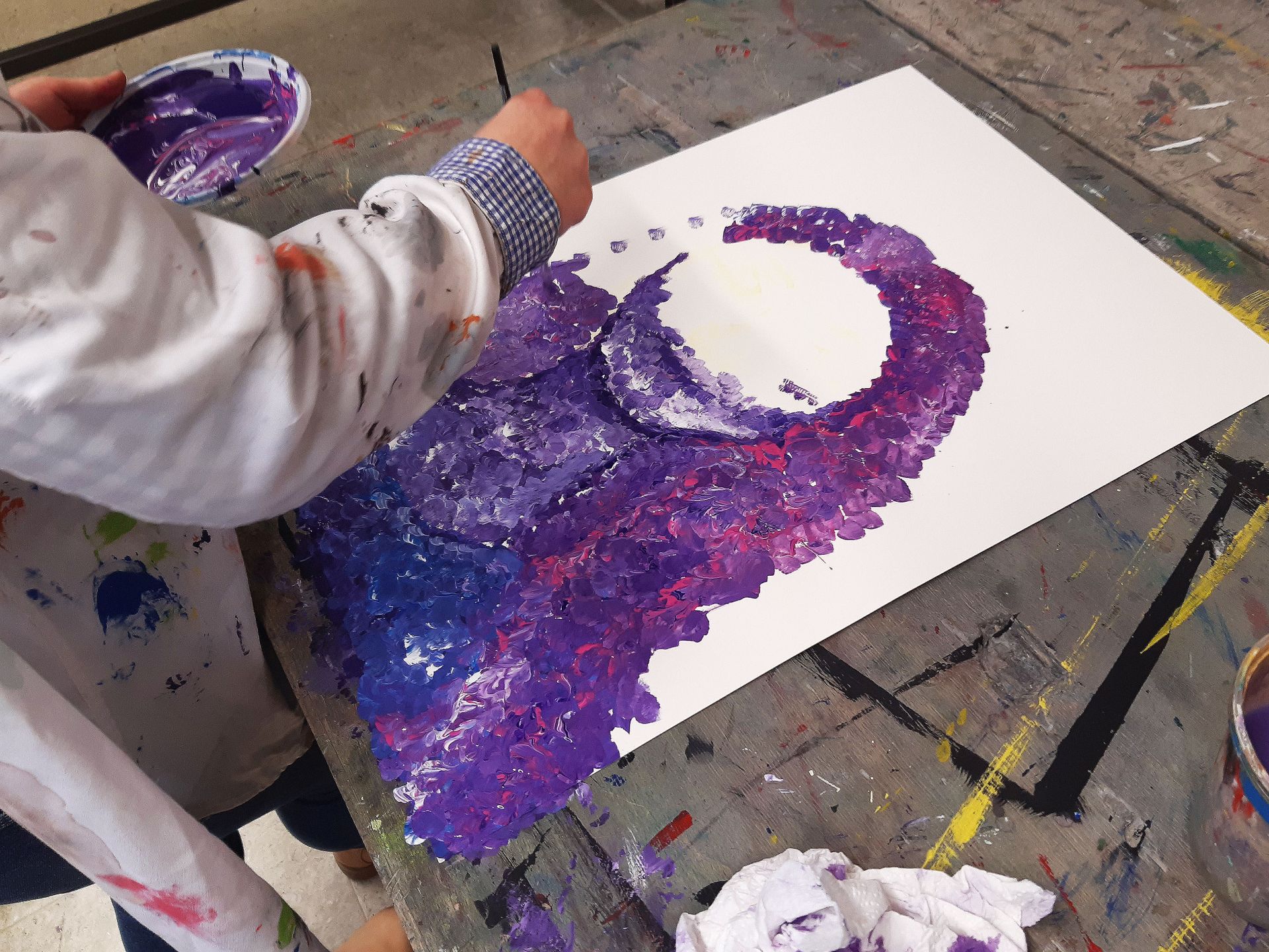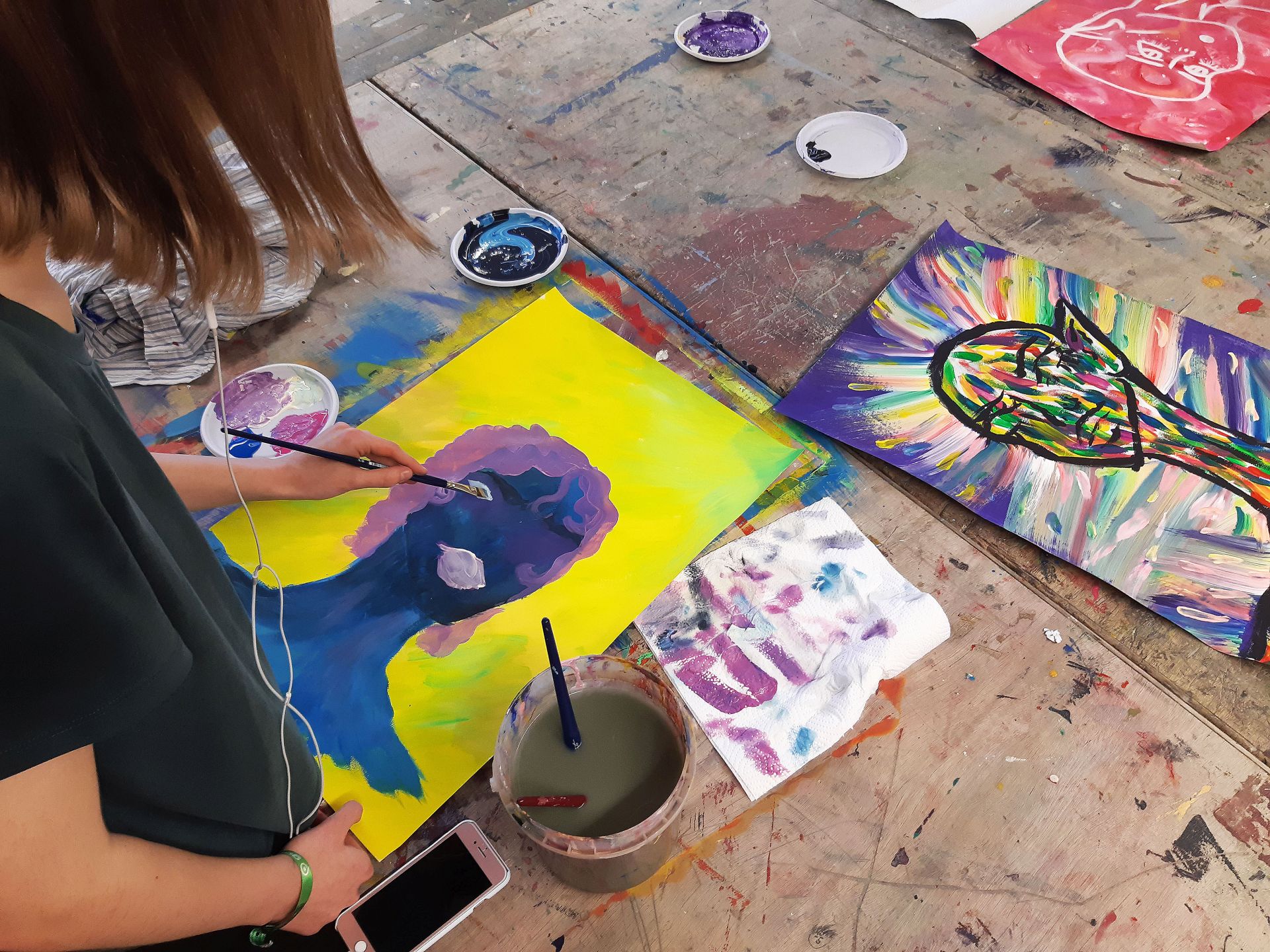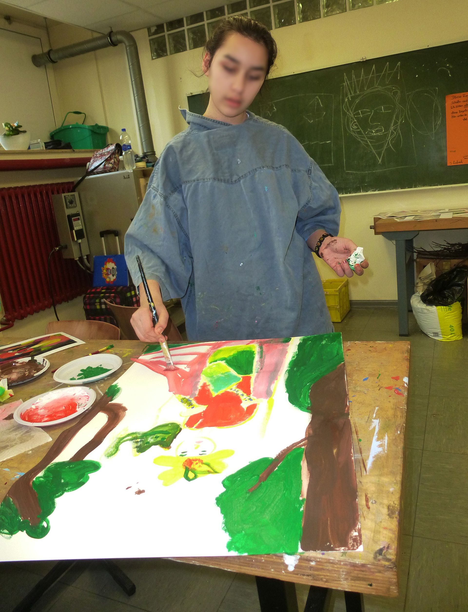 Die Schüler/innen der neunten Klasse nutzen die Möglichkeit, sich künstlerisch frei auszudrücken mit viel Spaß, Engagement und Konzentration. Sie haben sich intensiv auf den Ausdrucks- und Entstehungsprozess eingelassen und es entstanden beeindruckende, überraschende, berührende und spannende Bilder.