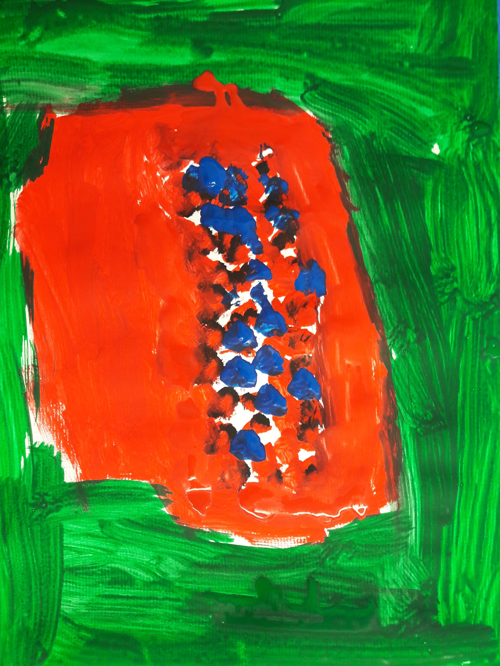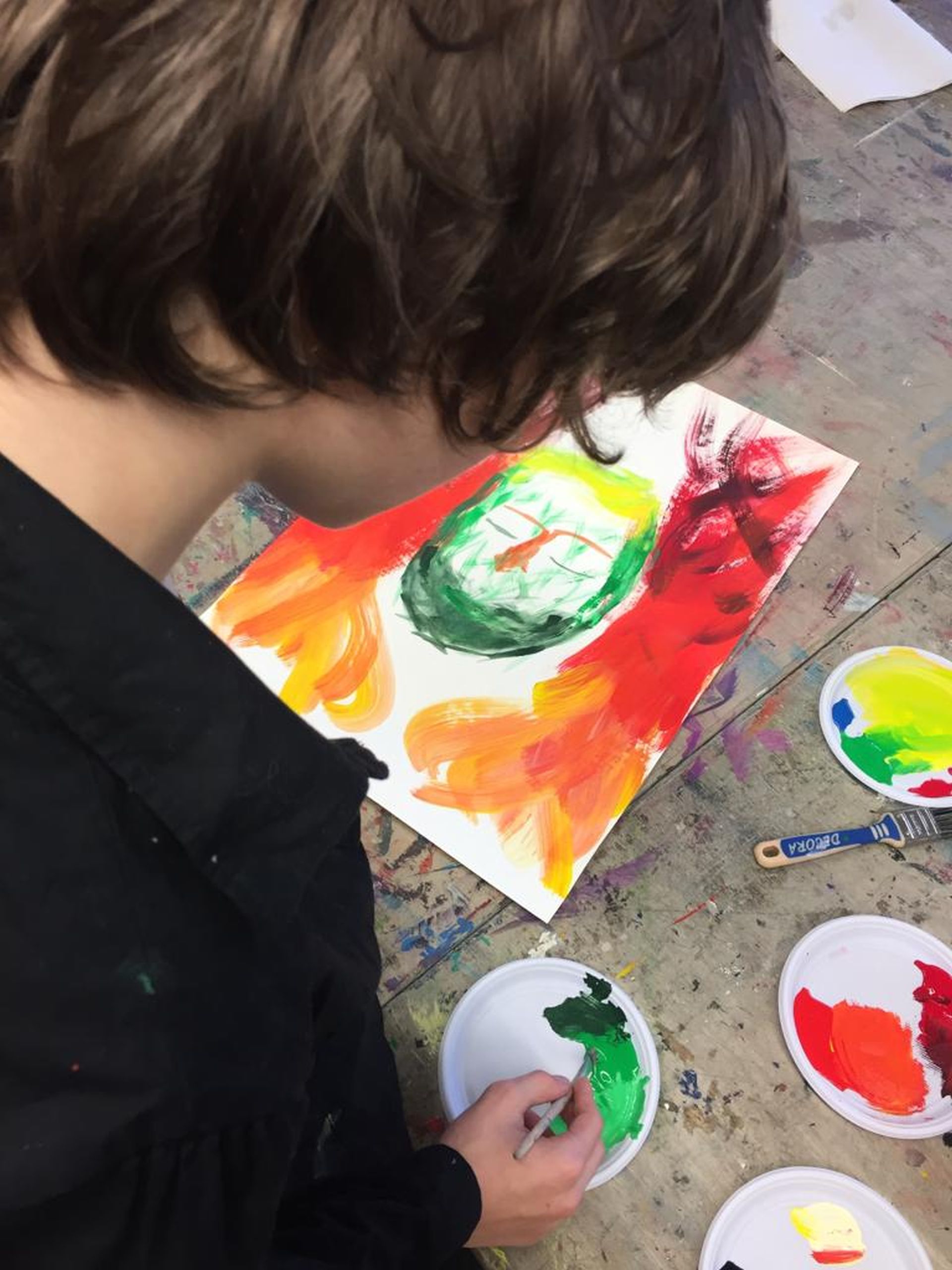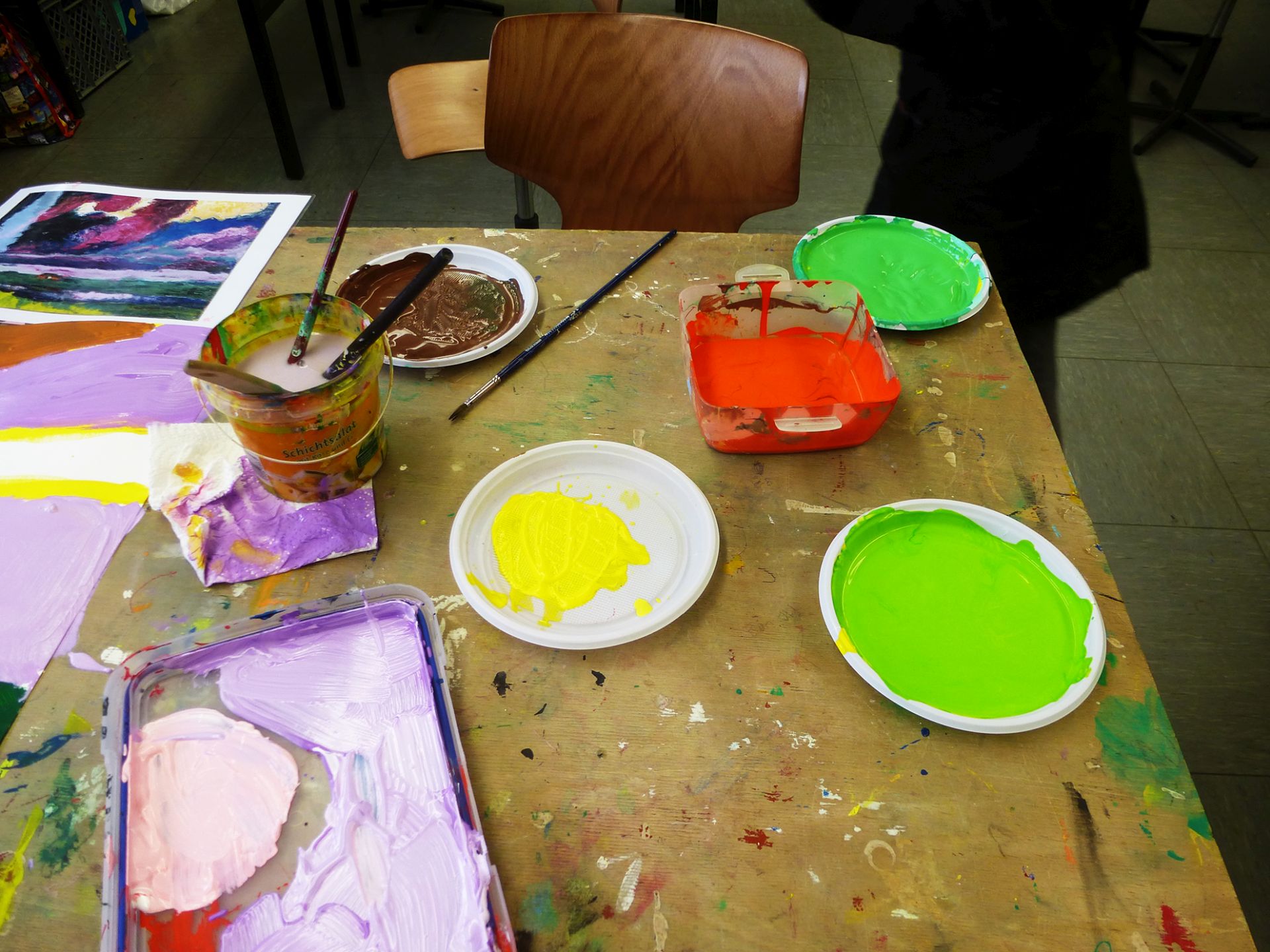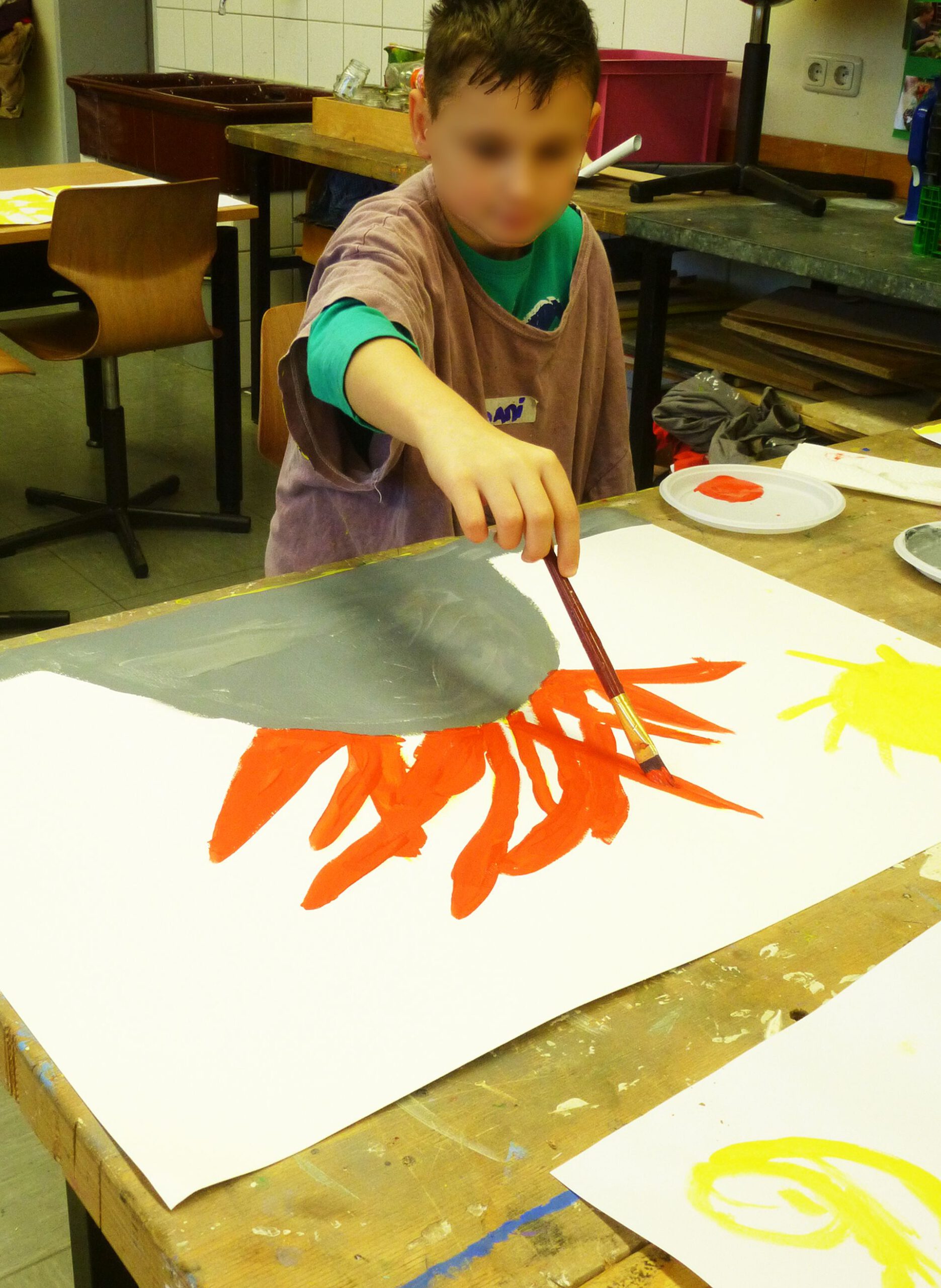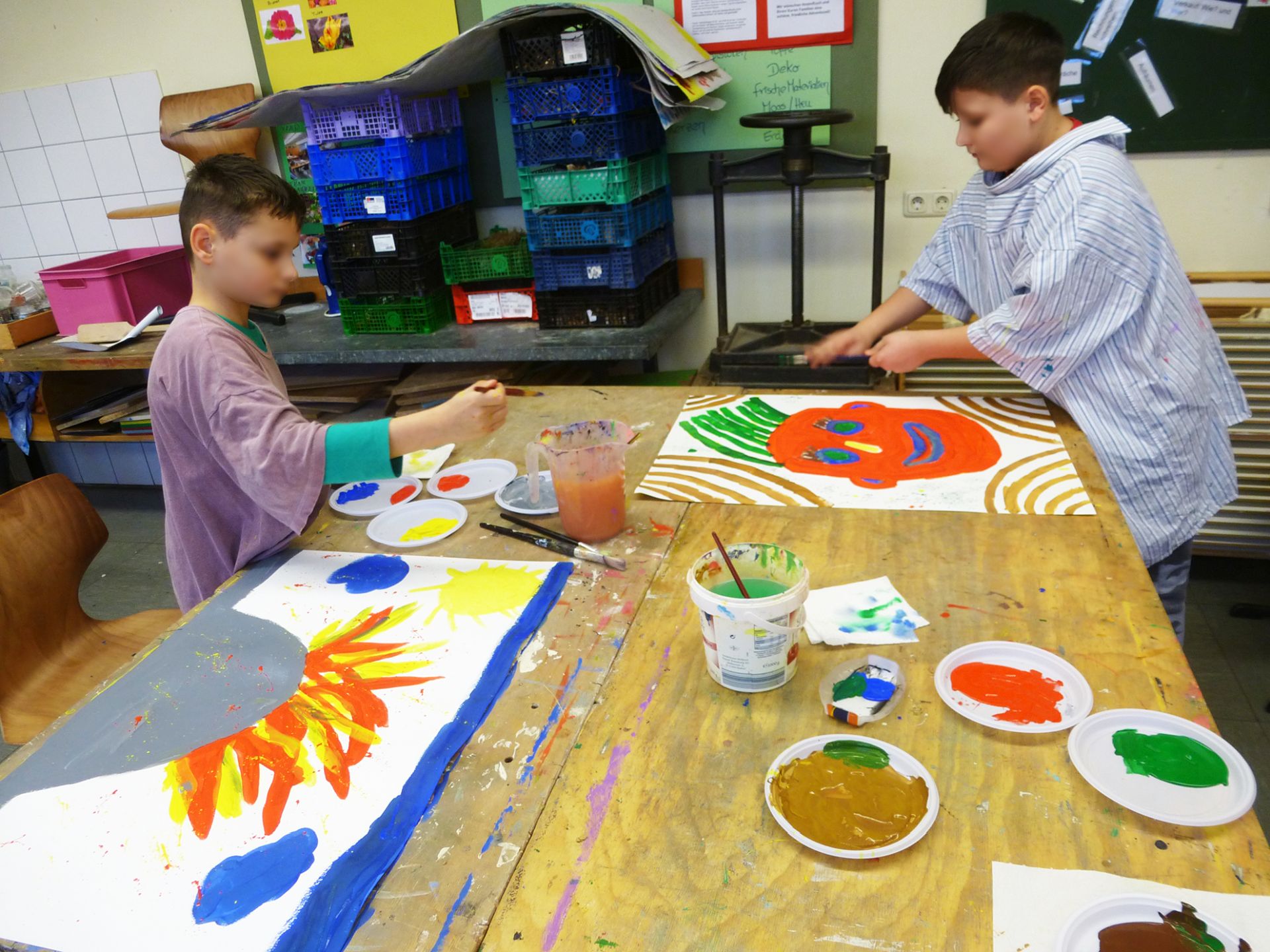 „Das bin ich. Seht her – hört zu“! Die Schüler/innen wurden an die Werke und das Leben bedeutender Expressionisten herangeführt. Sie lernten deren Intentionen und Leidenschaften Kunst zu schaffen kennen. Unter diesen Aspekten betrachteten und erforschten die Kinder, lebhaft und interessiert, die Bilder und Bildsprache dieser Künstler/innen.Inspirierend für Alle war, wie viele Assoziationen aus dem Dargestellten sie zu ihrer heutigen Erlebniswelt aus Internet und Fernsehen, herstellen konnten.Die Kinder begannen ihr eigenes, expressionistisches Ausdrucks- Erlebnis, im ersten Schritt, mit dem malerischen Ausdruck ihre Gefühle und Stimmungen, frei in Form und Farbe.Gearbeitet wurde immer mit Acryl auf großen Formaten.