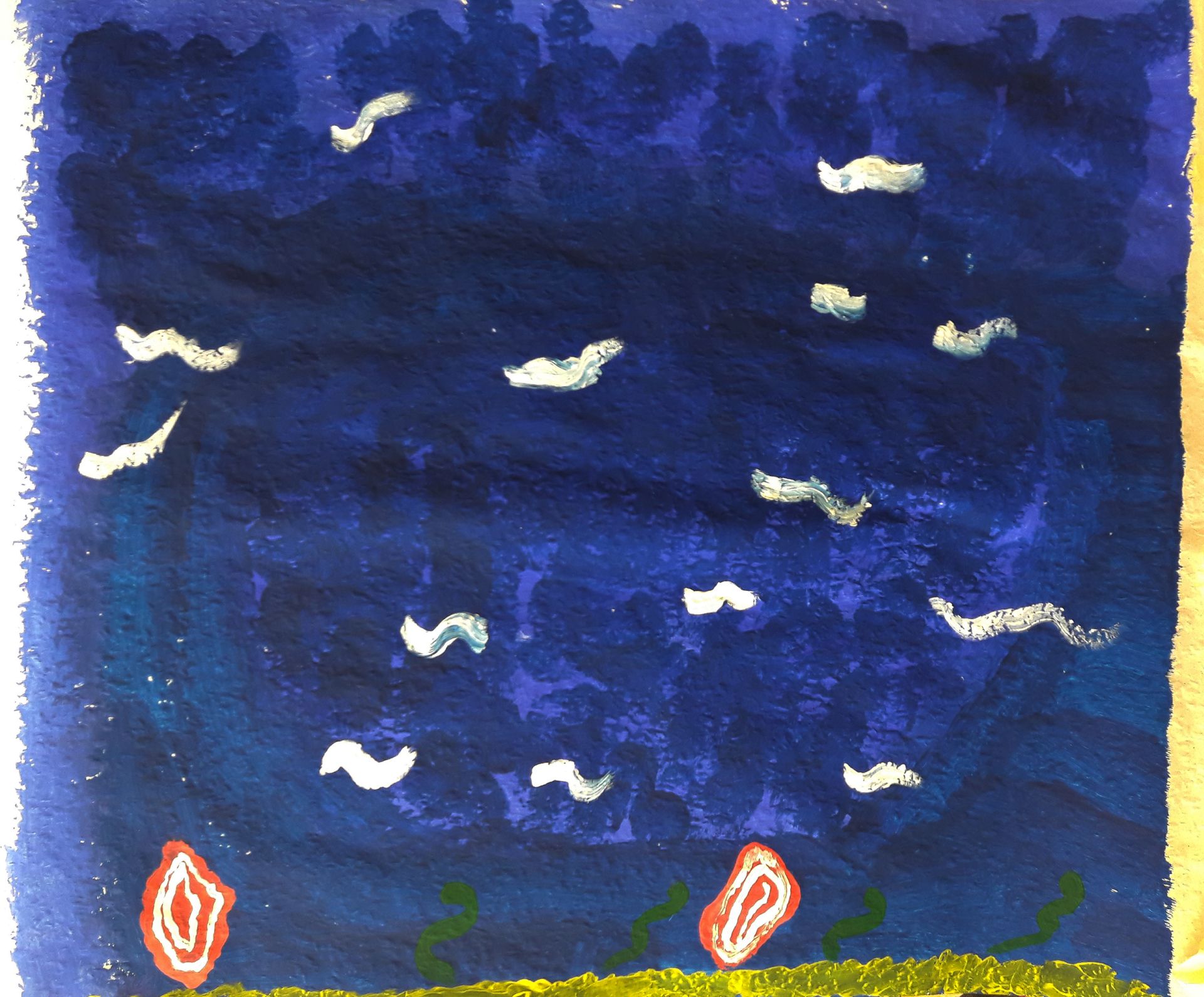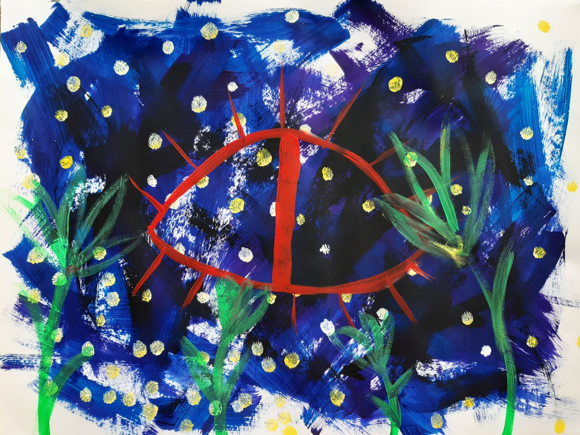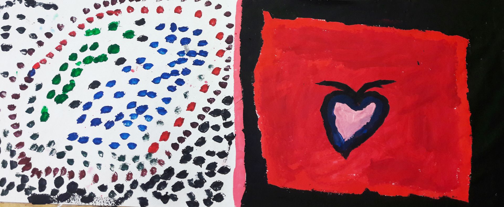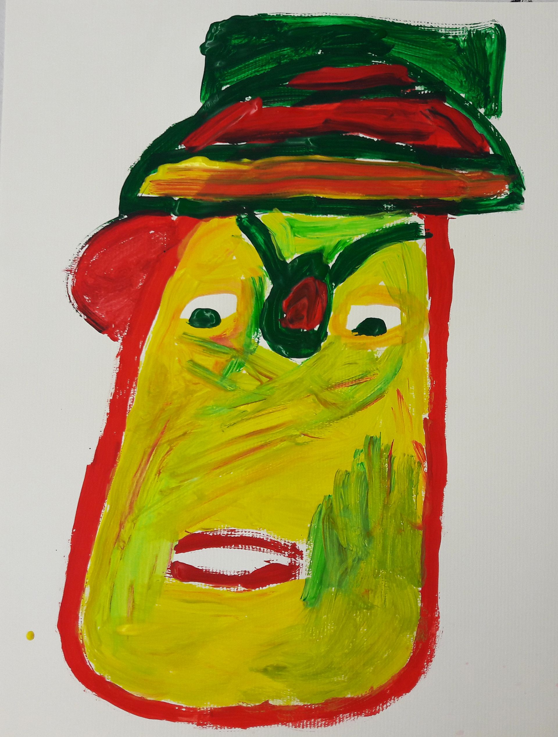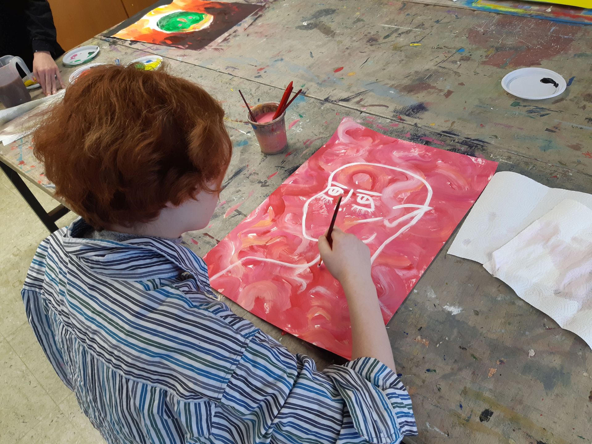„Das bin ich. Seht her – hört zu“! Die Schüler/innen wurden an die Werke und das Leben bedeutender Expressionisten herangeführt. Sie lernten deren Intentionen und Leidenschaften Kunst zu schaffen kennen. Unter diesen Aspekten betrachteten und erforschten die Kinder, lebhaft und interessiert, die Bilder und Bildsprache dieser Künstler/innen.Inspirierend für Alle war, wie viele Assoziationen aus dem Dargestellten sie zu ihrer heutigen Erlebniswelt aus Internet und Fernsehen, herstellen konnten.Die Kinder begannen ihr eigenes, expressionistisches Ausdrucks- Erlebnis, im ersten Schritt, mit dem malerischen Ausdruck ihre Gefühle und Stimmungen, frei in Form und Farbe.Gearbeitet wurde immer mit Acryl auf großen Formaten.