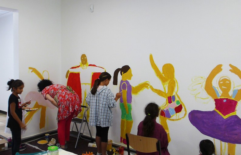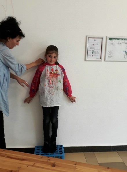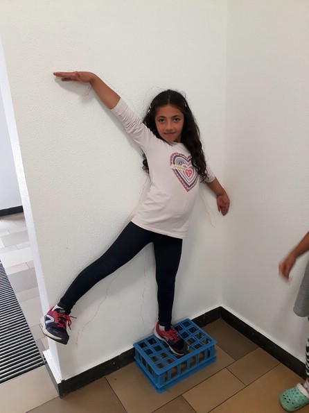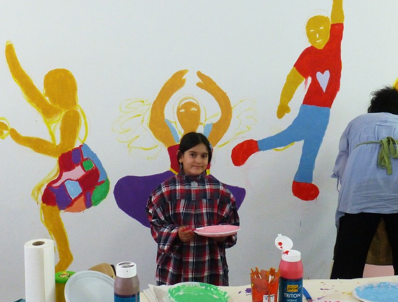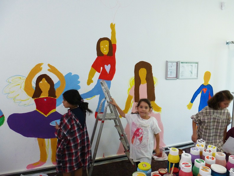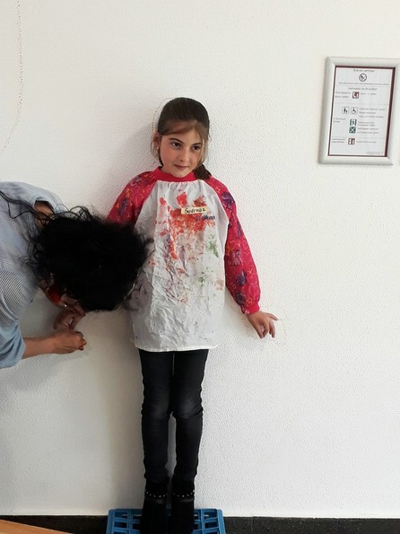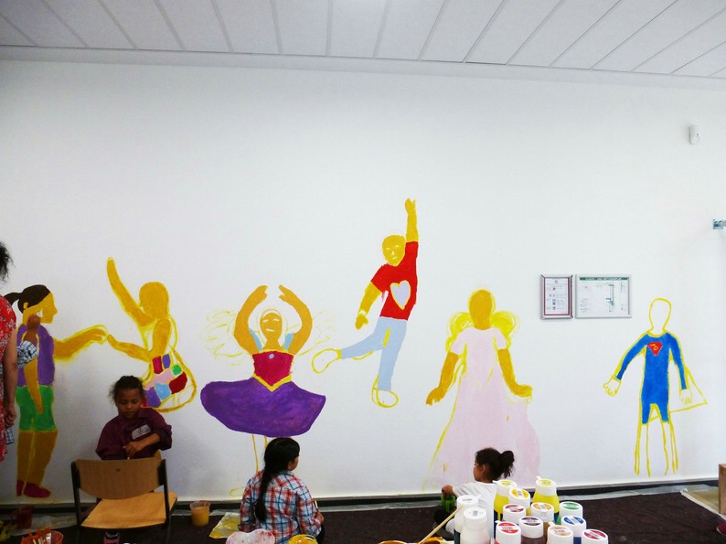 Zehn Kinder der zweiten Klasse gestalteten die Eingangshalle ihrer Schule. Mit Acrylfarben malten sie sich selbst auf die Wände. Ihre künsrtlerische Freiheit umfasste die Wahl, wie und als wen oder was, sie sich selbst darstellen wollen.