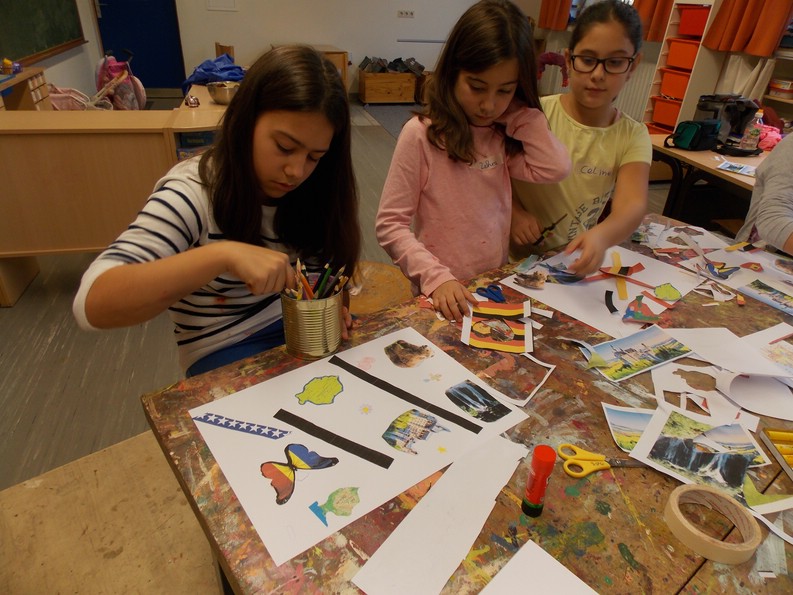 Kinder aus verschiedenen Kulturkreisen gestalteten Collagen und malten mit Acrylfarbe auf Leinwänden.