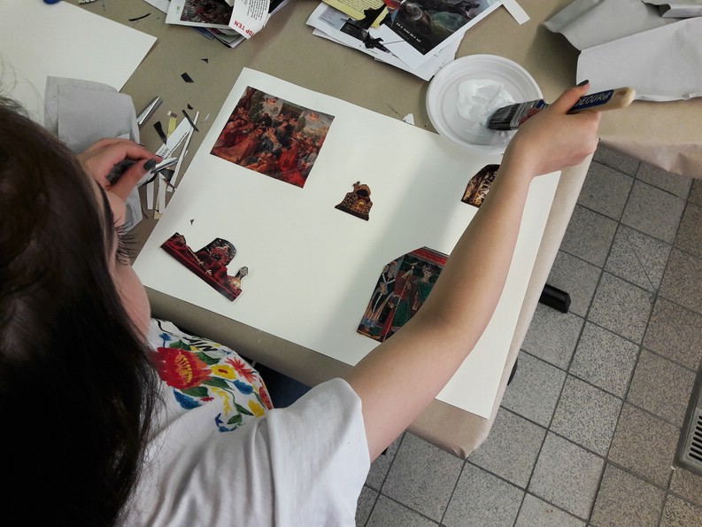 Zwei Kunst- Kulturtage in der Hauptschule Oberhausen, im Rahmen des Kulturagentenprogramms. Auswählen, kleben, mit Acrylfarbe malen und drucken, mit unterschiedlichsten Materialien wie Schwamm, Kronkorken, Holzstücken, Q-Tips und vielem mehr.